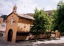 La ermita se construyó originariamente sobre uno de los torreones de la Puerta de Soria y sobre el arco de entrada, mediante paredes de tapial, para lo cual se derribó la parte superior de ésta, se tapió parte del arco original, del que todavía puede adivinarse su forma primitiva, y se construyó uno nuevo, de ladrillo, que es el que se ve en las fotografías. El edificio primitivo ocupaba una tercera parte del actual (lo que hoy es la sacristía y el espacio donde está colocado el altar, y donde se celebra el culto), y a él se accedía desde el interior del arco de la Puerta de Soria. Dicha entrada fue tapiada al cerrarse el acceso a ésta para conformar el corral de una vivienda particular, por la parte inferior, y se rellenó de escombro y cegó en 1987, dejando el hueco de la entrada bajo del nuevo suelo que se puso a la sacristía.